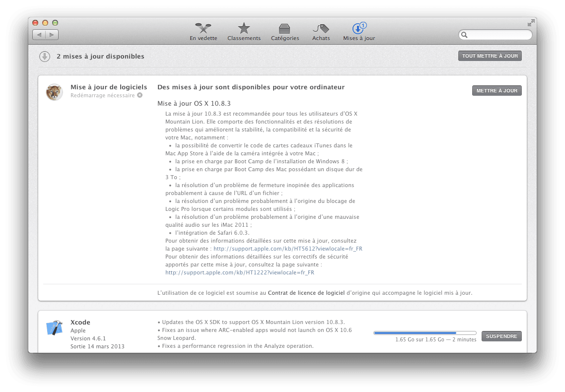 La nouvelle mise à jour pour MAC OS X est disponible. C’est en toute logique que l’on passe de Mountain Lion 10.8.2 à Mountain Lion 10.8.3. Parmi les nouvelles fonctionnalités phares on retiendra, la possibilité de convertir le code de cartes cadeaux iTunes dans le Mac App Store via la caméra de son iMac, MacBookPro, MacBook Air, la prise en charge de l’installation de Windows 8 par Boot Camp (voir notre tuto) ainsi que le support des disques durs de 3 To (toujours pour Boot Camp), et, l’intégration de Safari 6.0.3. La mise en jour en Mountain Lion 10.8.3 est recommandée et s’effectue toujours par le biais du menu Pomme et Mise à jour de logiciels. Voici ci-dessous en détails tous les ajouts et correctifs de cet update :